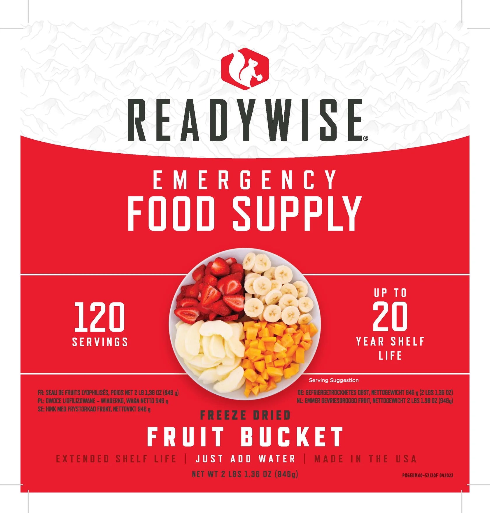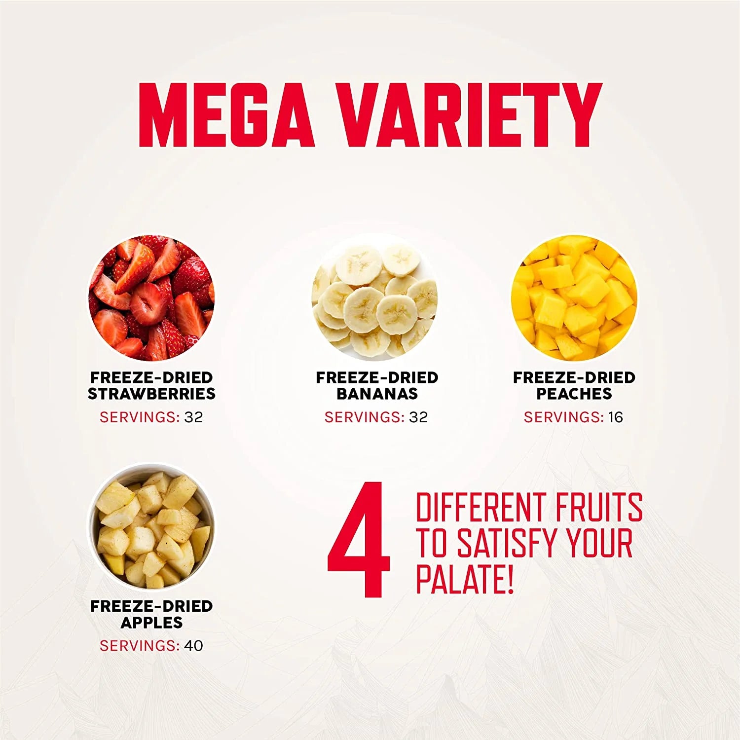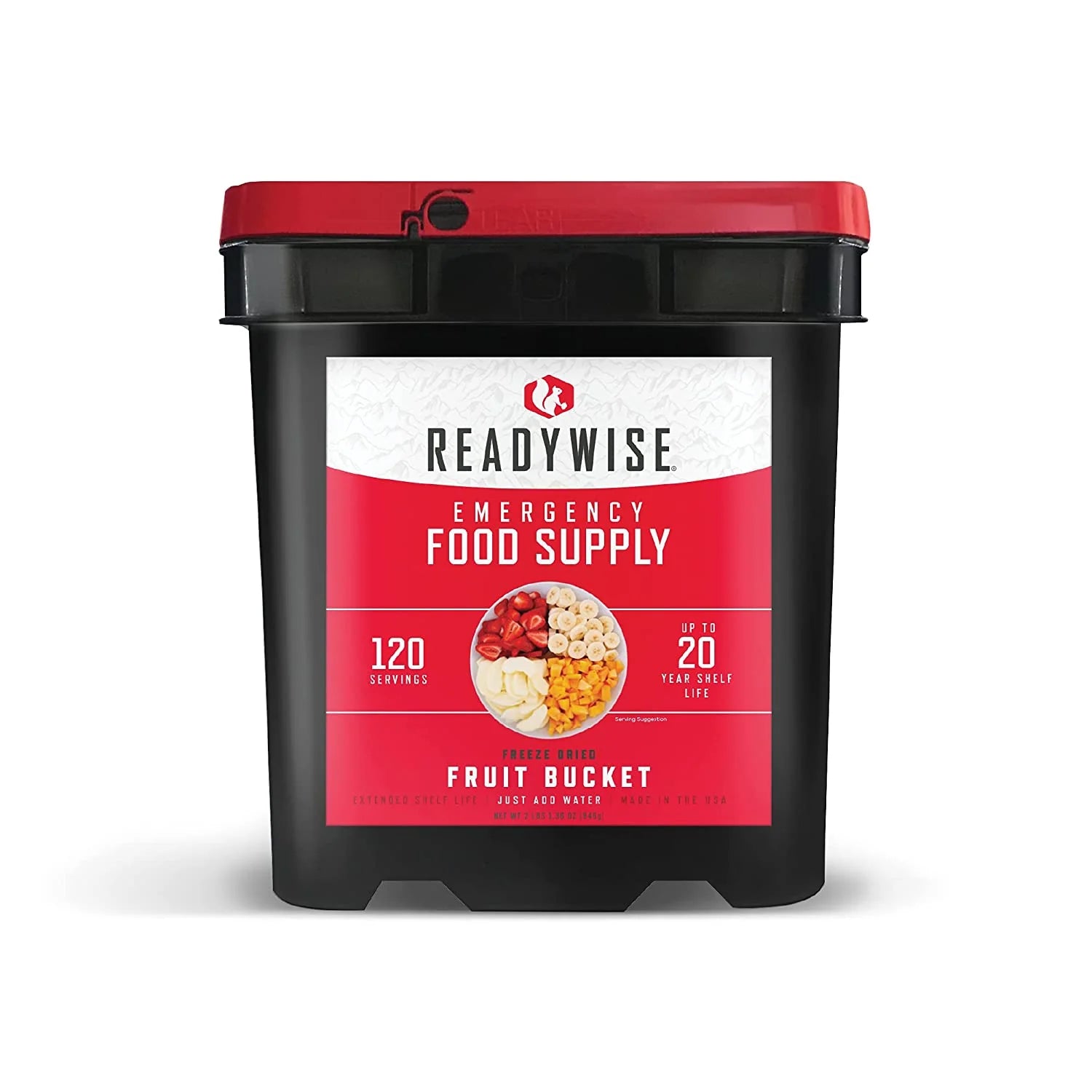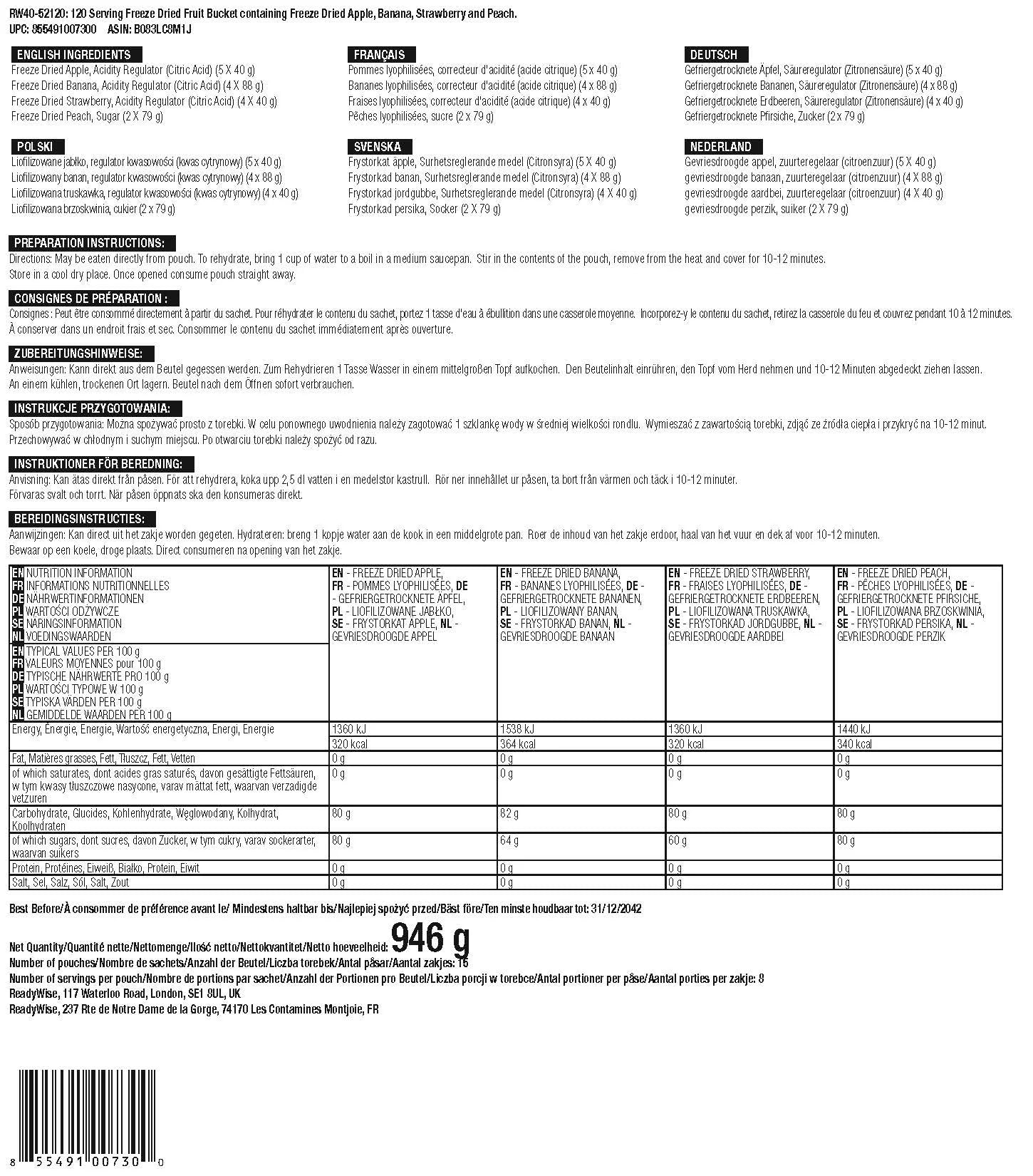 Elke emmer bevat 120 porties van 4 verschillende soorten fruit, waaronder bananen, aardbeien, perziken en gevriesdroogde appels.